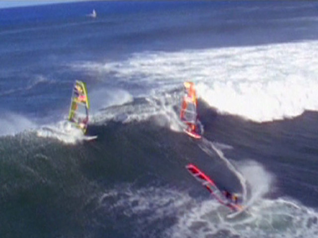 Доска приводится в движение парусом. Этот снаряд называют виндсерфингом, или «парусной доской».