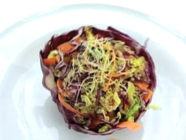 Рецепт изысканного салата.Состав:морковь — 1 штука;овощной бульон — 2 столовых ложки;куиноа — 1 столовая ложка;салат — 3 листа;красная капуста — 30 гр;перец — 20 гр;ростки чеснока, оливковое масло.