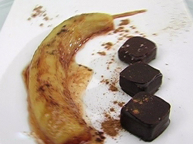 Вкуснейший десерт из банана и меда.Состав:банан — 1 штука;масло — 1/2 столовой ложки;мед — 1 столовая ложка;корица — 1 щепотка;шоколад — 3 конфеты.